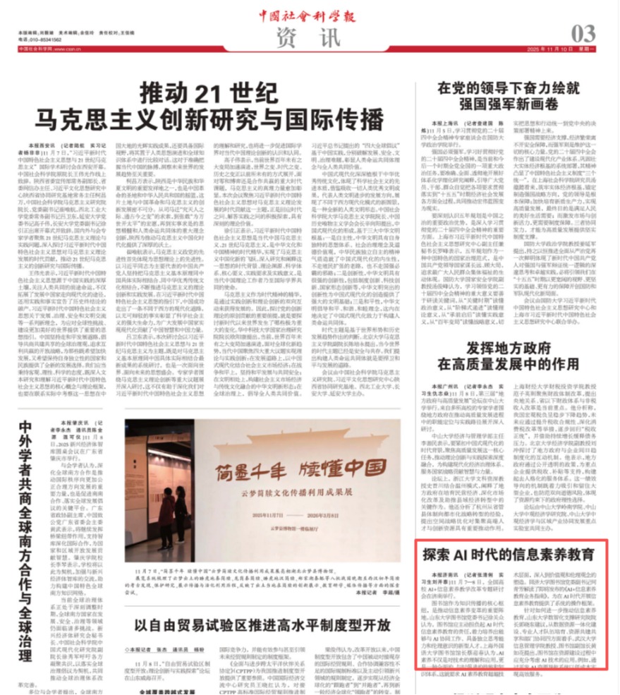 全国高校AI+信息素养教学改革专题研讨会2025年11月7-9日在济南召开,人民网、中国社会科学网(中国社会科学报)、新浪、搜狐、新黄河、山东商报等媒体对会议进行了报道,汇总如下:序号报道名称信息来源报道时间1聚焦AI时代的信息素养教育人民网-理论频道2025年11月18日2探索AI时代的信息素养教育 - 中国社会科学网中国社会科学网2025年11月10日 3关于公布全国高校AI+信息素养教学改革优秀案例/课件征集评审结果的通知山东...